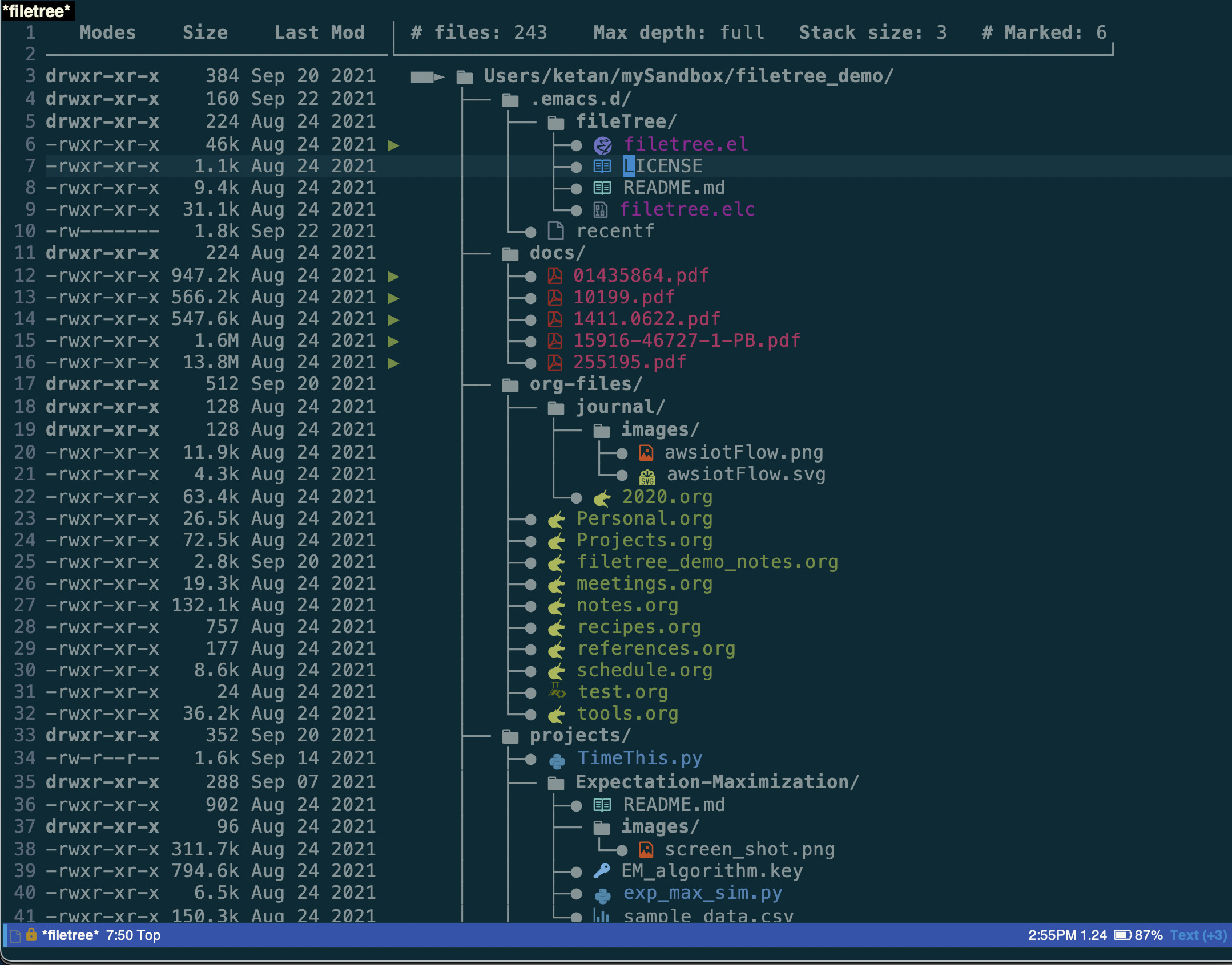 The filetree default view. One can cycle between notes, icons, directory info, tree depth…